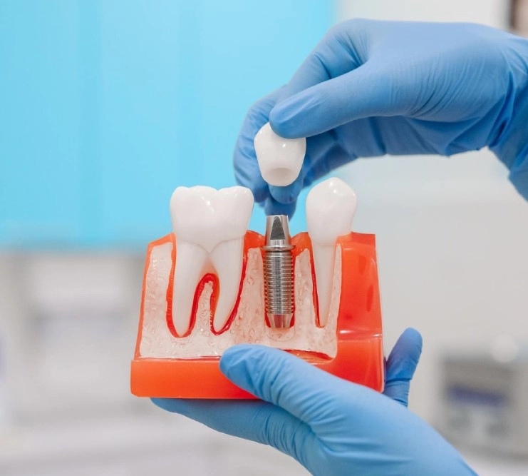 Способ фиксации коронок и мостов зависит от того, на что их устанавливают: на импланты или на собственные зубы. При установке протеза на имплант в боковом или дальнем отделе применяют винтовую фиксацию — изделие прикручивают, а снаружи маскируют композитным материалом так, что винт становится незаметен. Для передних отделов в зоне улыбки винты не используют, вместо этого коронка фиксируется стоматологическим цементом на абатменте.
