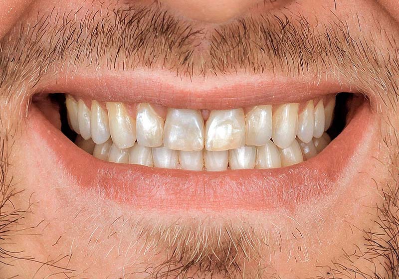 Пациент обратился с жалобами на эстетику фронтальной группы зубов: потемнение, дефекты эмали, неровность режущего края и передних стенок зубов. Был установлен комплекс цельнокерамических виниров на всю зону улыбки верхней челюсти.