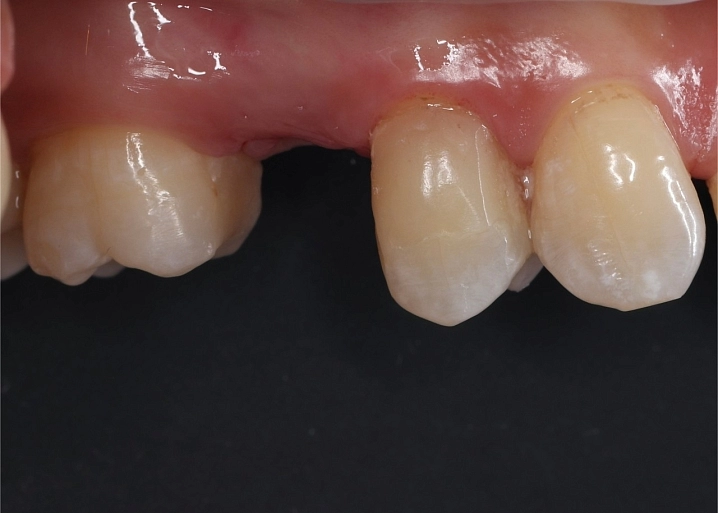 Пациенту была установлена одиночная цирконивая коронка на имплант на винтовой фиксации.