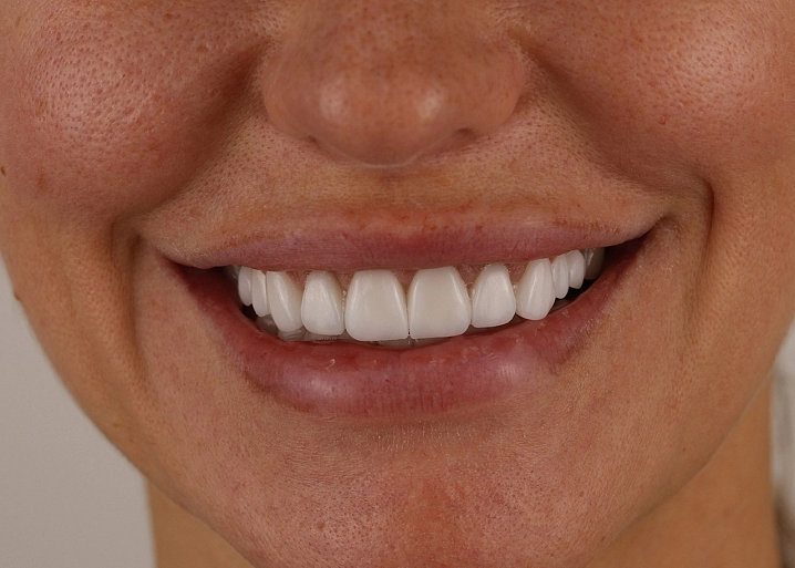 Была проведена моделировка и установка восьми виниров из керамики E-MAX на верхнюю челюсть.