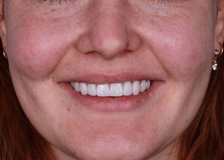 Проведена санация полости рта (удаление корней, лечение зубов) с последующей фиксацией циркониевых конструкций. Эстетика зубного ряда восстановлена.