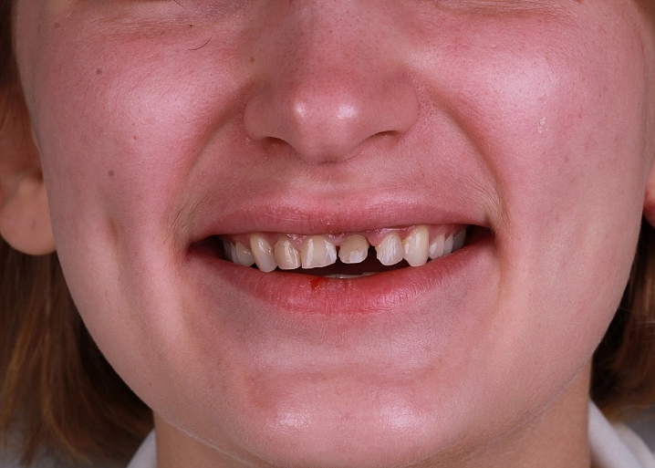 Пациентка обратилась в клинику с жалобами на эстетику фронтального отдела челюсти, на неудовлетворительный внешний вид улыбки.
