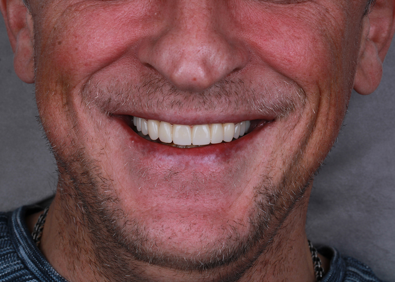 Проведена санация полости рта (удаление корней, лечение зубов) с последующей фиксацией циркониевых конструкций. Эстетика зубного ряда восстановлена.