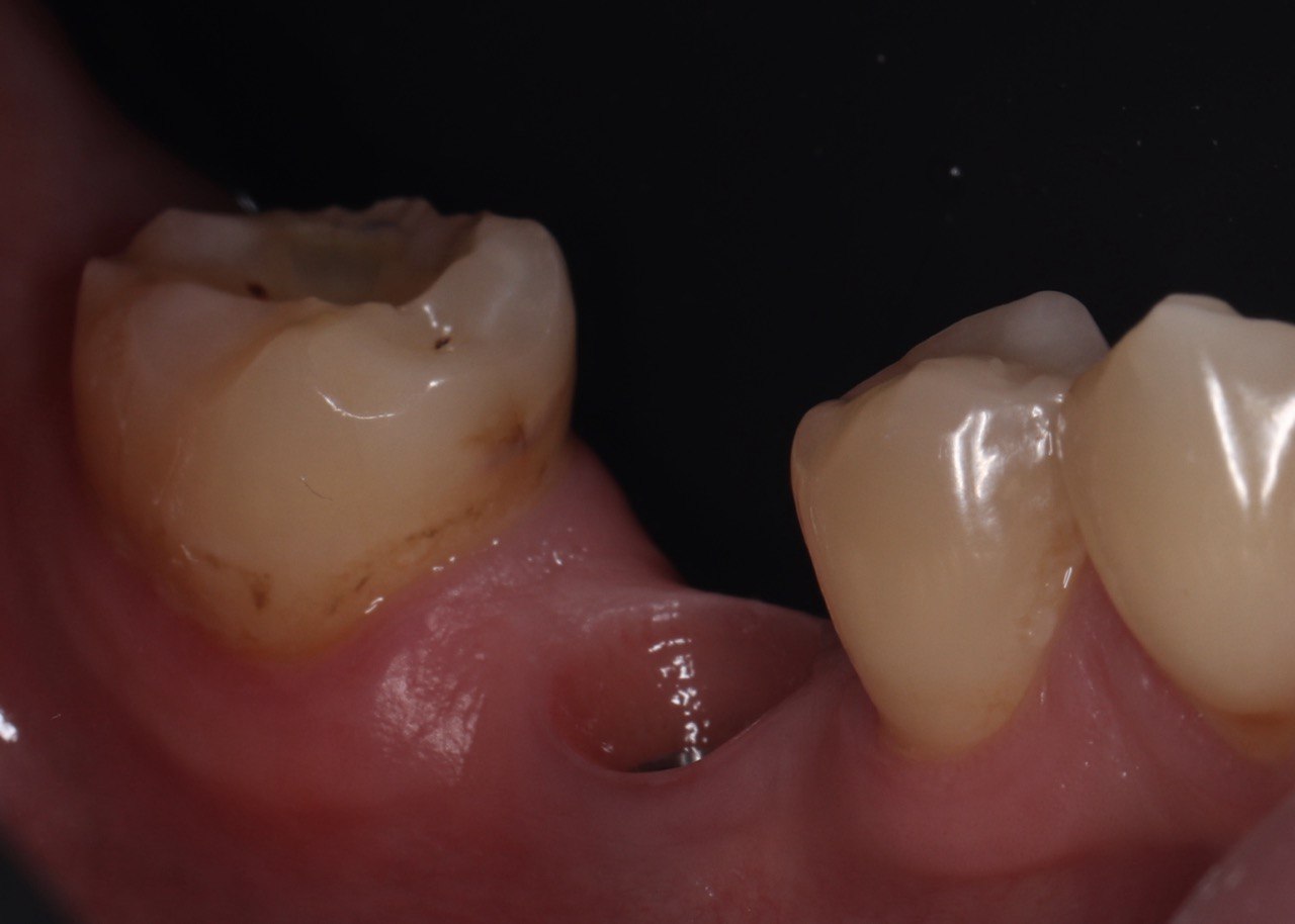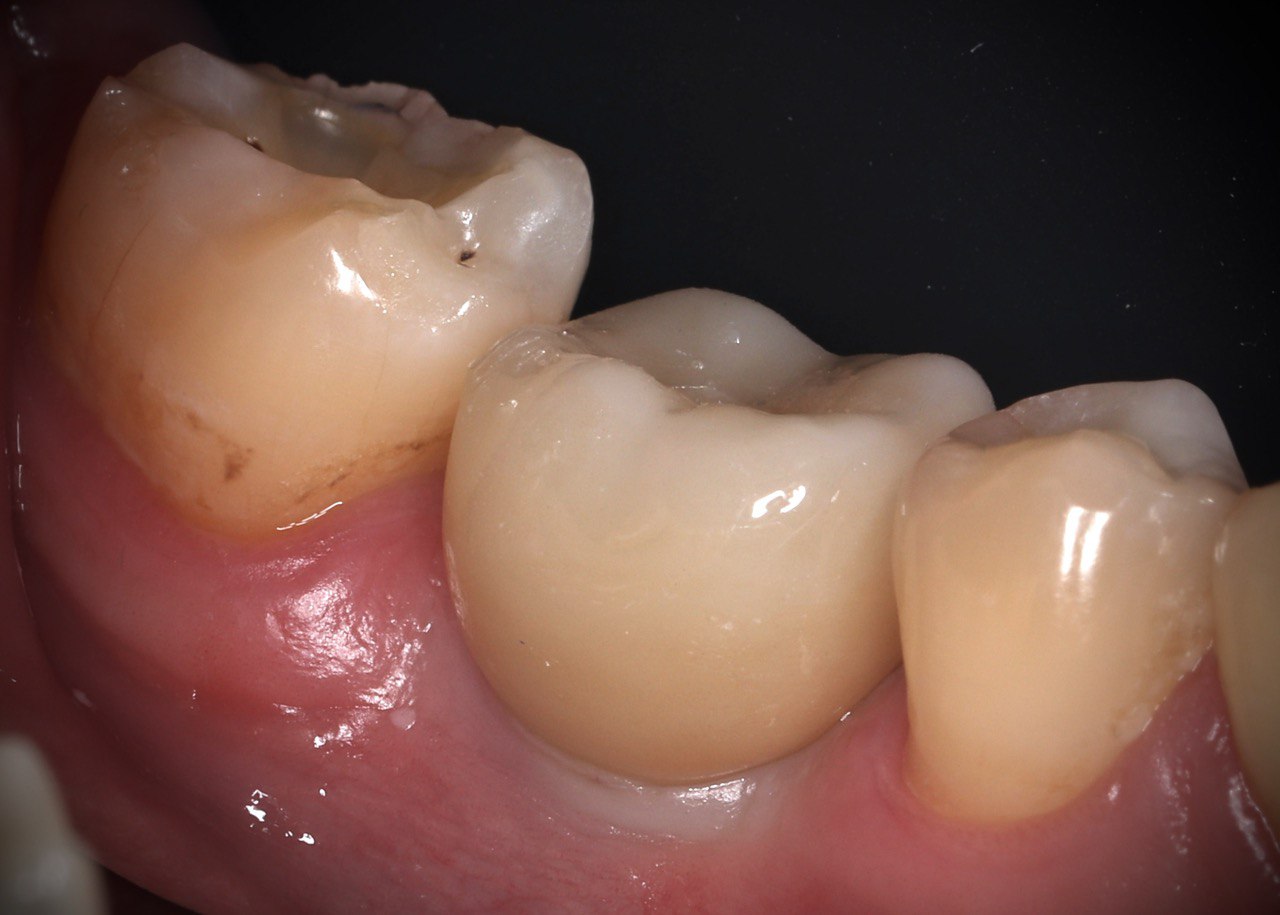 Пациенту поставлена циркониевая коронка на имплант с винтовой фиксацией. В результате восстановлены эстетика и жевательная функция, возвращено привычное качество жизни.